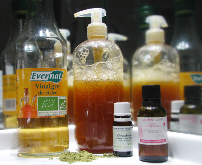 Comme vous pouvez le constater, la bouteille est déjà entamée, j'ai utilisé ce shampooing plusieurs fois et il fait bien son travail. Pour avoir des reflets, il faut le laisser poser un peu. Je pense que la prochaine fois, je remplacerai l'eau florale de camomille par un peu de macérât huileux de camomille, pour rendre le shampooing plus riche et un peu moins liquide.