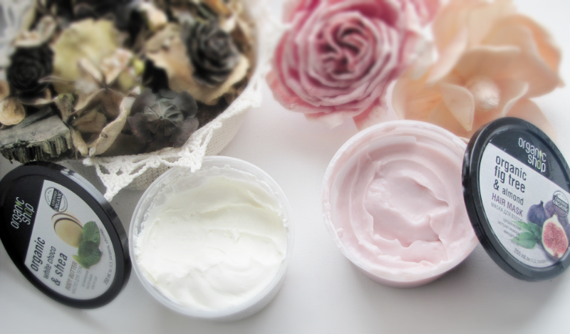 Voyons tout de suite deux produits de chez Organic Shop : le masque pour cheveux à la figue, et le beurre corporel au chocolat blanc.
