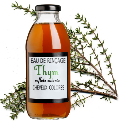 Pour l'eau de rinçage au thym, c'est très simple. Faites bouillir des branches de thym 20 minutes dans un litre d'eau, puis filtrez. Ajoutez 10 cuillères à soupe de vinaigre de cidre une fois la préparation refroidie.