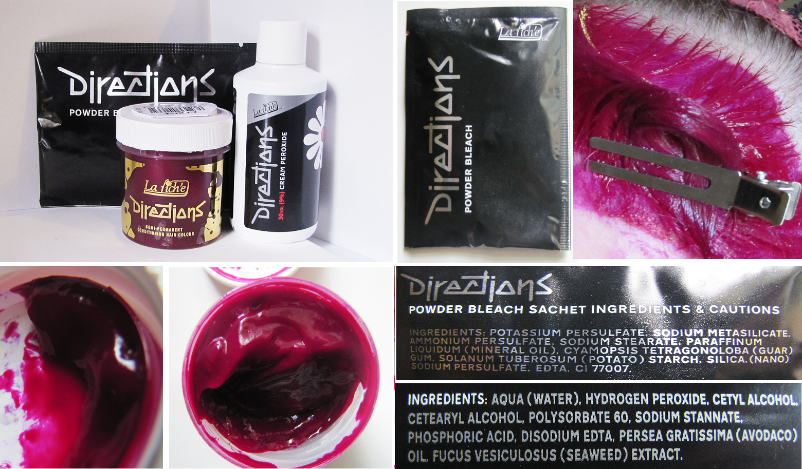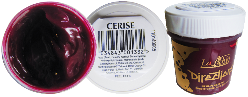 J'aime beaucoup ma frange de couleur, mais le procédé de décoloration m'ennuie et ce n'est jamais une partie de plaisir. L'odeur, la sensation de picotement, la composition... Bref, la décoloration est une sorte de "contrainte" et j'épluche en ce moment les solutions alternatives, c'est à dire les teintes qui prennent le mieux sur des cheveux clairs, non décolorés. Parmi elles, le rouge, le noir évidemment, les verts très sombres, les roses (mais qui rendent violets, sans décoloration) et certains violets. C'est déjà un éventail assez large mais le bleu est exclu, ce qui est dommage.