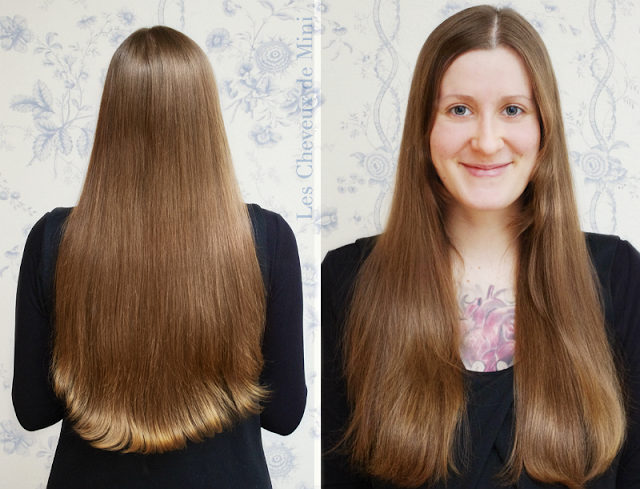 Autant dire que je suis ravie..! La couleur est plus proche de la réalité sur la première photo (c'est difficile à capter par temps gris et pluvieux...) mais la différence racines - longueurs se voit mieux sur la photo de droite. Je précise que j'ai fait ce masque surtout pour retrouver ma blondeur après deux mois d'alitement qui n'ont pas arrangé mes cheveux, devenus châtains...