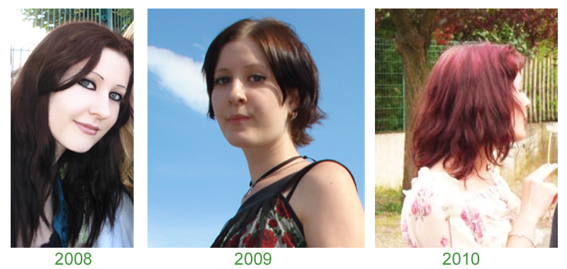 - 2008 : Cheveux noirs dont la couleur a dégorgé, Fructis et compagnie, pointes monstrueuses, démêlage long, brushings approximatifs..