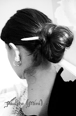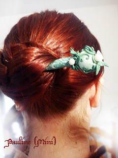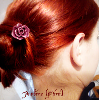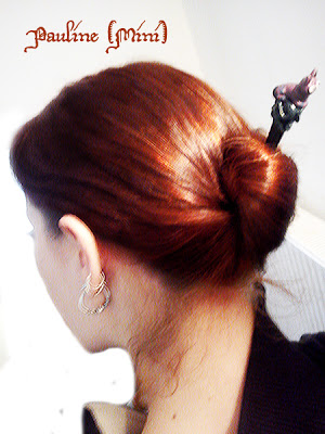 Vous aurez sans doute reconnu les hairsticks utilisés ! Le premier est une sorte de French Twist (chignon banane) version piqué, le second est un chignon effet volume (la troisième photo est un détail du même chignon) et le troisième chignon est un chinese bun avec le Perle d'elfe qui va bien à mon roux je trouve !