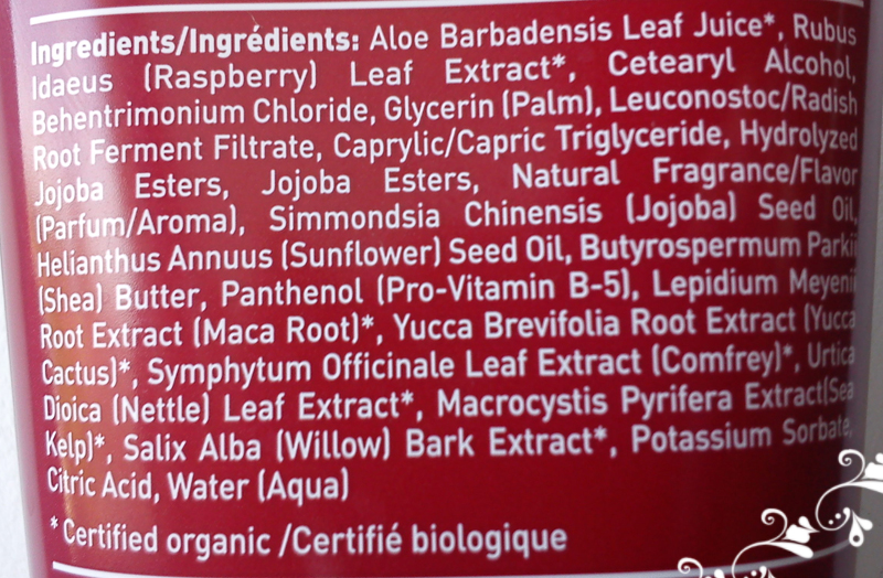 • Sa composition : Gel d'aloe vera, Extrait de feuilles de framboisier, Cetearyl Alcohol, Chlorure de Behentrimonium, Glycérine (palme), Filtrat de racines de radis, Triglycérides capryliques, Esters de jojoba hydrolysées, Esters de jojoba, Parfum naturel (arôme), Huile de graines de jojoba, Huile de tournesol, Beurre de karité, panthénol (pro-vitamine B-5), Extrait de racine de maca, Extrait de racine de Yucca, Extrait de feuille de consoude, Extrait de feuilles d'ortie, Extrait de varech, Extrait d'écorce de saule*, Sorbate de potassium, Acide citrique, Eau