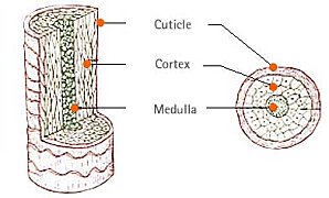 | Schéma de la structure du cheveu : Cuticule, Cortex, Moelle. |