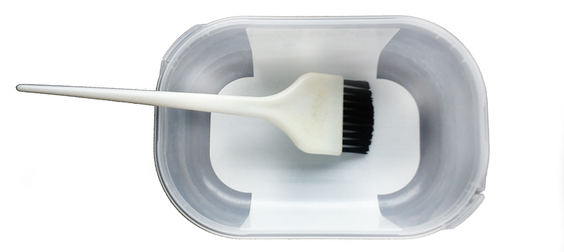 | Pour préparer le henné : un pinceau et un récipient en plastique. |