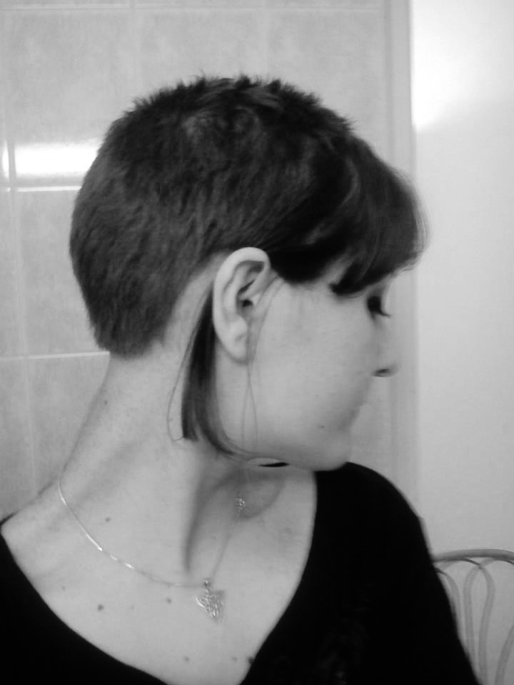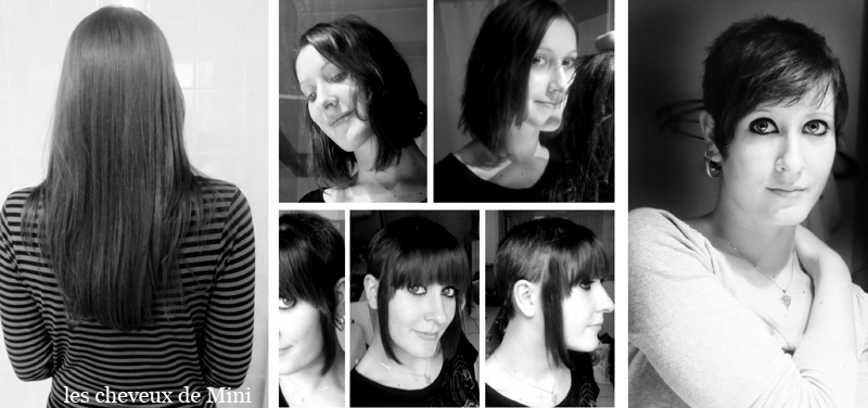 J'ai donc commencé par faire un carré légèrement plongeant. Un élastique, des ciseaux, couic, et la grosse mèche était là ! Le lendemain, le carré plongeant a fini en carré très court, puis en coupe chelsea l'espace d'une journée, j'avais encore des cheveux devant : une frange et deux grandes mèches. Ensuite, j'ai de nouveau coupé, et affiné la mèche devant. Et ça y est, j'étais passée aux cheveux courts.