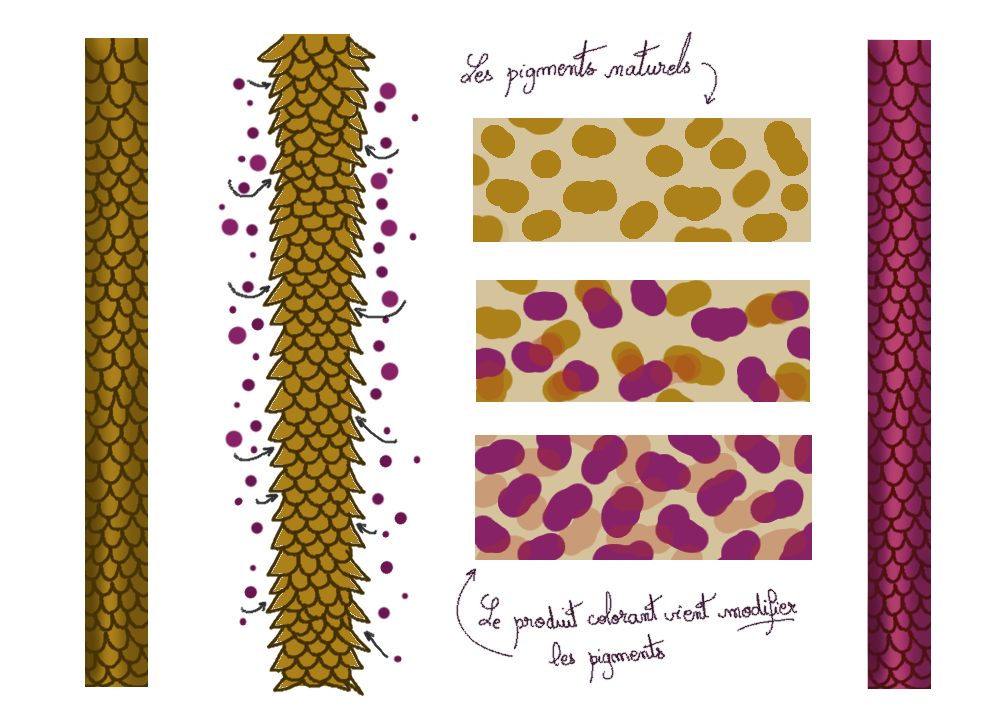 Une fois que vous avez appliqué votre mélange, une réaction chimique se fait entre la couleur et l'oxydant. Le mélange est très alcalin, ce qui fait que la fibre capillaire gonfle, et que les écailles se soulèvent. Les écailles étant soulevées, les pigments synthétiques peuvent venir modifier et remplacer les pigments de vos cheveux. Ensuite, lorsque vous rincez, les écailles se referment (mais malheureusement elles ne sont plus aussi lisses qu'avant) et vos cheveux ont pris la couleur que vous avez appliquée. La décoloration s'applique sur le même principe, mais elle retire les pigments.