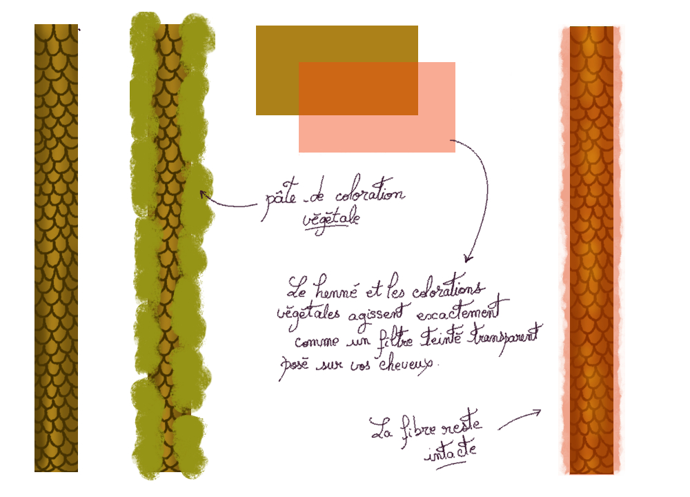 La coloration végétale, au henné ou diverses poudres de plantes, n'agit pas du tout de la même façon, puisqu'elle ne va pas soulever les écailles de vos cheveux pour aller modifier les pigments. En fait, elle agit plutôt comme une sorte de film transparent coloré qui vient s'appliquer par dessus vos cheveux. En dessous, votre cheveu est encore naturel !