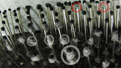 Et ensuite, entourés en blanc sur l'image, on peut remarquer des amas de poussière, enroulés autour des picots et difficiles à retirer (cette brosse n'est absolument pas pratique à nettoyer). Ces amas de poussière sont donc quasiment toujours présents sur la brosse et on passe donc sur ses cheveux les saletés, poussières et pollutions accumulées les jours précédents.