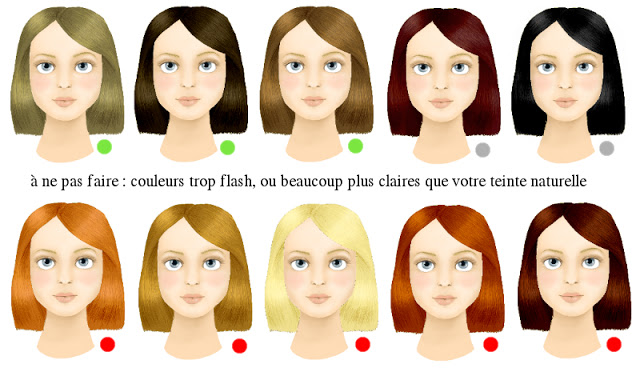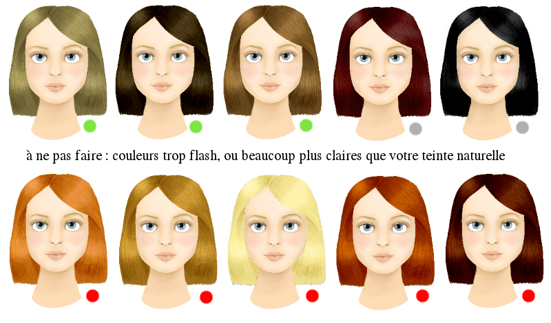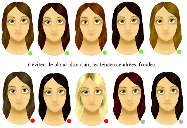 Les trois premières couleurs mettent clairement en valeur le visage : l'une d'elles est la couleur naturelle. A éviter absolument, les roux trop flash, le blond platine, les teintes chaudes... Le cuivré peut être utilisé, mais avec parcimonie ! Il existe des cuivrés assez légers, juste pour donner un reflet. Mais les cuivrés conviennent beaucoup plus aux personnes ayant le teint très pâle et les yeux très colorés, bleu profond ou vert.