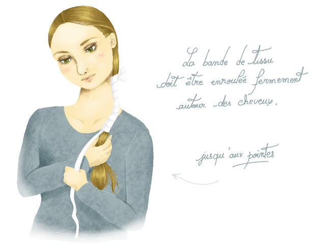 Le mot en lui-même, c'est la bande de tissu utilisée pour cette technique. C'est une bande de tissu assez épais et solide. La technique, elle, consiste à enrouler les cheveux à partir d'un peu en dessous de la nuque et jusqu'aux pointes en serrant bien. De cette façon, ils gardent une position raide et sont protégés durant la nuit !