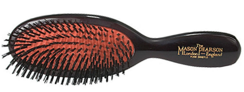 Pour mes 100 coups de brosse le matin (50 tête en bas + 2x25 de chaque côté tête en haut) j'ai une Mason Pearson sanglier/nylon. Quand je l'avais commandée il y a plusieurs années j'ai eu peur de prendre celle qui n'a pas de nylon car c'était pas recommandé pour mes cheveux épais et donc j'avais peur de casser un si bel objet. Les poils pénètrent parfaitement dans ma chevelure et j'en suis très contente.