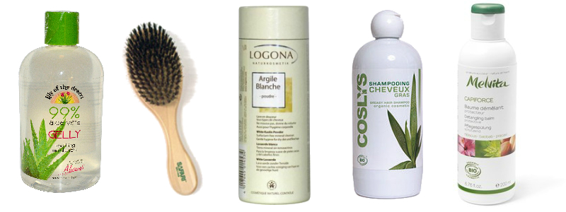 Gel d'aloé vera, brosse sanglier, argile blanche (shampooing sec) shampooing pour cheveux gras, après-shampooing pour cheveux secs.