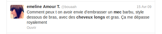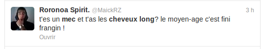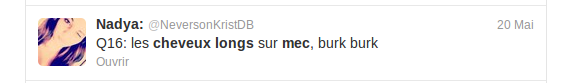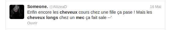J'avoue que certaines remarques sur twitter font peur... Il y a des gens, je te jure, ils méritent des baffes ! ^^ Et pas seulement en ce qui concerne le sujet des cheveux longs...