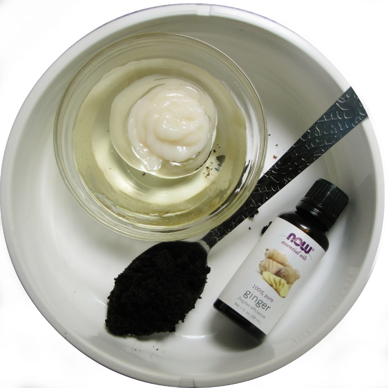 > Une fois tous les ingrédients mélangés, ajoutez le marc de café. Mélangez bien jusqu'à ce que les grains soient bien répartis, rajoutez-en un peu si besoin.