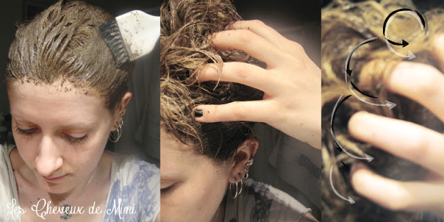 L'application se fait sur cheveux secs, cela permet de mieux sentir la répartition du gommage. Je vous conseille de l'appliquer en racine, à l'aide d'un pinceau, c'est plus facile pour séparer les mèches. Vous devez sentir le "froid" du produit sur le cuir chevelu, il doit vraiment toucher juste vos racines et votre cuir chevelu.
