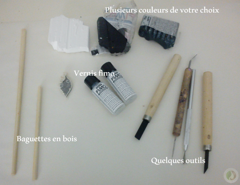 Alors le matériel, je prends la fimo sur Creavea.com ou n'importe où pourvu que j'en trouve à pas trop cher, pour tous les outils (j'en ai une vingtaine) j'en ai eu pour à peu près 50 euros (j'en ai plusieurs de très bonne qualité et d'autres qui coûtent un euro, ça fait une moyenne). Les outils on les trouve en magasin de bricolage/maquette ou de loisirs créatifs. la fimo ça coûte 2 euros le carré de pâte, donc selon le nombre de couleurs ça grimpe assez vite. Le vernis est assez introuvable et coûtait dans mes souvenirs dans les 5 euros (le gros pot). Pour le matériel supplémentaire (poudre argentée, or, fils de fer, perles, paillettes, poudre blanche) je compte à peu près 30 euros aussi. voila voila !