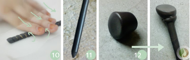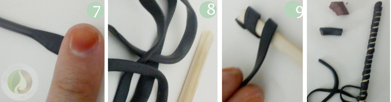 Enroulez ce ruban autour de votre baguette sans faire de bord-à-bord : il doit toujours y avoir un petit espace durant tout le tour (photo n°9). C'est important sinon votre pic à cheveux risque d'être trop large. Une fois l'enroulage fini, coupez l'excédent de pâte.