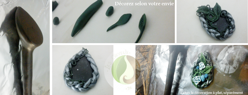Décorez comme bon vous semble ! Je suis partie sur une base en forme de goutte, mais si votre base est ronde, vous pouvez faire une déco sur une base ronde. J'ai tressé trois brins de fimo grise sur le tour de la goutte, et j'ai ensuite rajouté des feuilles et des fleurs.