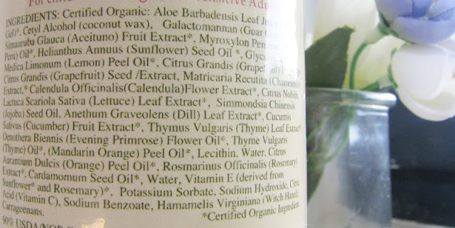 Ingrédients (INCI) : Certified organic aloe barbadensis leaf juice*, cetyl alcohol, galactomannan, simauruba glauca fruit extract*, myroxylon pereirae oil, helianthus annuus seed oil*, glycerin, citrus medica limonum peel oil*, citrus grandis peel oil*, citrus grandis seed/extract, matricaria recutita extract*, calendula officinalis (calendula) flower extract*, citrus nobilis, lactuca scariola sativa leaf extract*, simmondsia chinensis (jojoba) seed oil, anethum graveolens (dill) leaf extract*, cucumis sativus (cucumber) fruit extract*, thymus vulgaris (thyme) leaf extract*, oenothera biennis (evening primrose) flower oil*, thymus vulgaris (thyme) oil*, (mandarin orange) peel oil*, lecithin, water, citrus aurantium dulcis (orange) peel oil*, rosmarinus officinalis (rosemary) extract*, cardamomum seed oil*, water, tocopherol*, potassium sorbate, sodium hydroxide, citric acid, sodium benzoate, hamamelis virginiana, carrageenans.