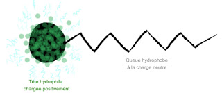 Eh bien, sur les quats, la partie hydrophile de la mollécule est chargée d'ions positifs, exactement comme sur ce petit schéma. La tête de la molécule est attirée par l'eau, et aussi par tout ce qui est chargé négativement.