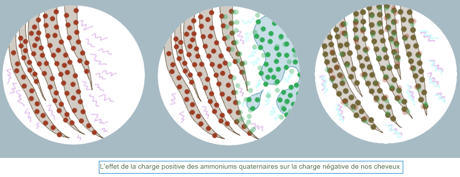 La surface de nos cheveux attire les quats car sa charge est négative : nos petites mollécules de quats viennent donc s'y coller, partout où elles peuvent, pour neutraliser leur charge positive. Un peu comme si elles cherchaient leur moitié ! Et le tout se transforme en charge "neutre" :
