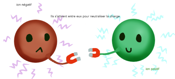 | Les ions négatifs et positifs s'attirent car ils cherchent toujours à neutraliser leur charge en électrons. |