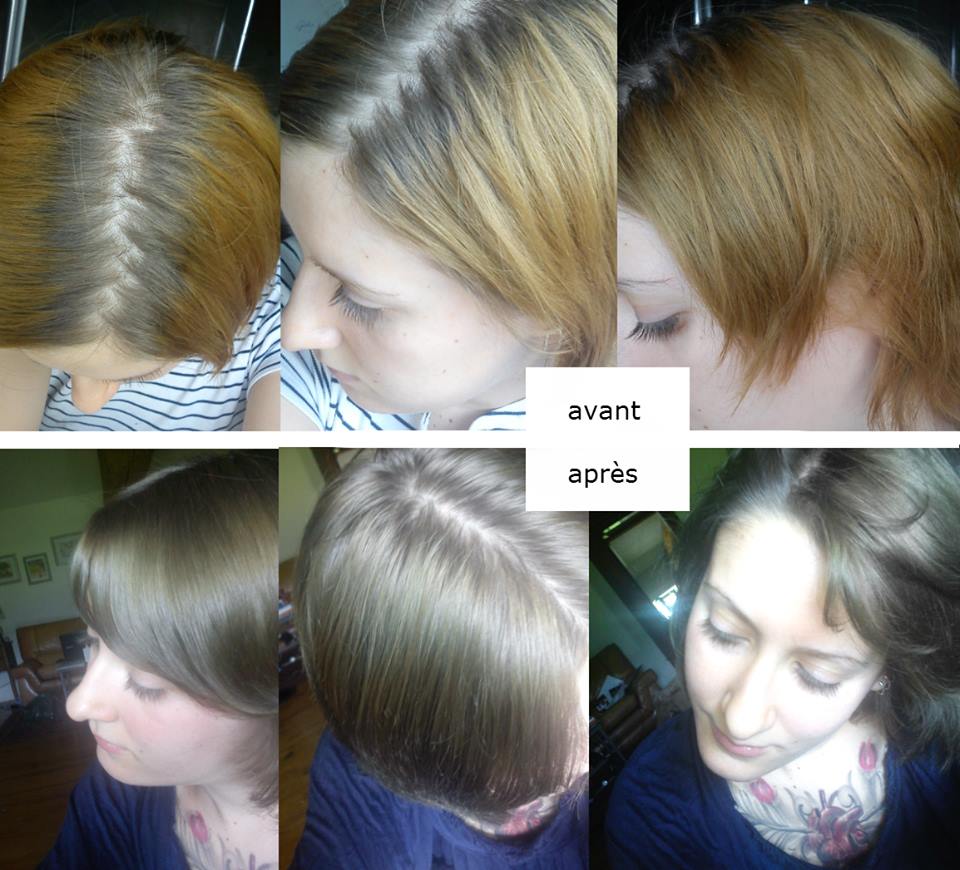 J'ai attendu 2 mois avant de me lancer car je voulais retrouver ma couleur naturelle. J'ai fait une première coloration achetée en grande surface, "blond clair cendré". Et là ce fut la cata ! Je suis ressortie blonde dorée avec de gros reflets cuivrés ��