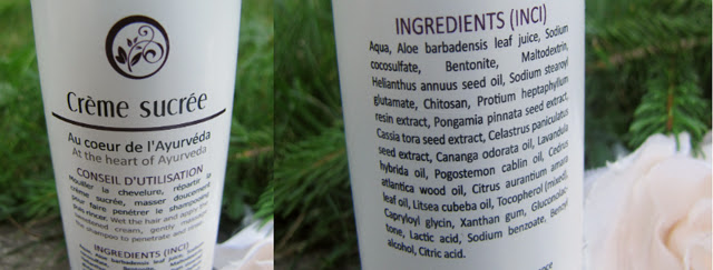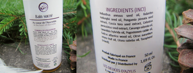 > La composition est riche en actifs, comme les huiles essentielles : l'Ylang-Ylang (Cananga odorata) mais aussi la lavande, le patchouli, cèdre de l'atlas, petit grain bigarade, May chang... Ce qui confère au produit une odeur absolument divine, si on aime les parfums naturels et apaisants.