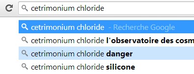 Pour le cetrimonium chloride, il suffit de faire exactement la même recherche. Sur Wikipédia, on apprend qu'il s'agit d'un antiseptique et d'un composé d'ammonium quaternaire : c'est un agent filmogène, qui sert en même temps de conservateur.