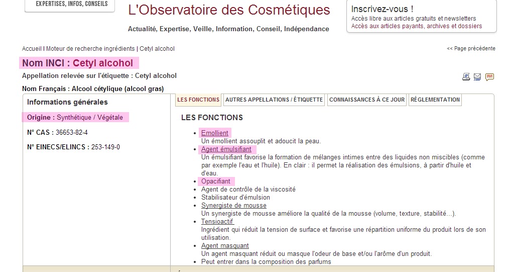 | Fiche du cetyl alcohol sur L'observatoire des cosmétiques |
