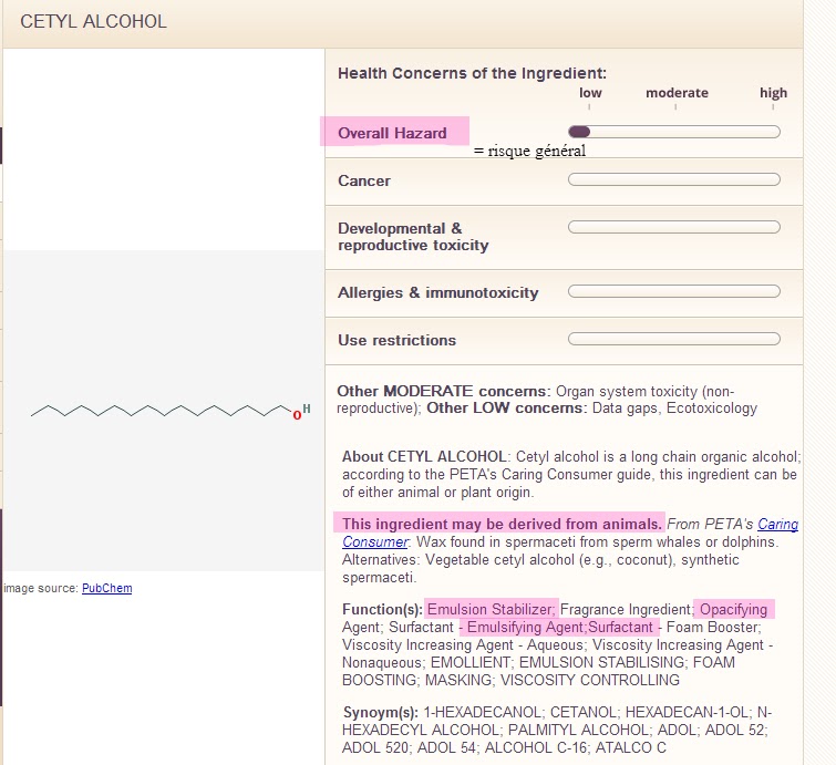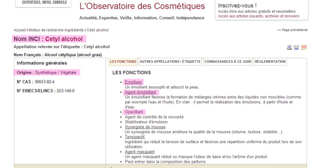 • Sur l'observatoire des cosmétiques, on nous confirme que l'alcool cétylique est bien un émollient : il sert aussi d'émulsifiant (c'est à dire à mélanger l'eau et l'huile). Et comme on l'a vu sur wikipédia précédemment, il sert d'opacifiant. On voit aussi qu'il peut être d'origine synthétique ou végétale, il peut donc être reconstitué chimiquement. Dans "règlementation", on apprend qu'il n'est pas soumis à des restrictions d'emploi, ce qui est plutôt rassurant.