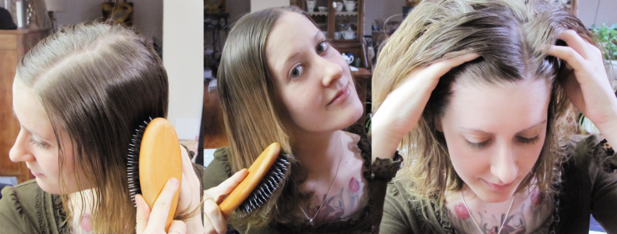 Tous les jours, le protocole est le même matin et soir. Un brossage la tête en bas, puis la tête droite, précédé si besoin d'un démêlage au peigne à dents larges. Après avoir brossé mes cheveux, je passe toujours mes mains sur mon cuir chevelu pour décoller les cheveux de celui-ci - d'ailleurs je suis certaine que c'est cela qui fait que les racines ont l'air moins grasses que les longueurs.