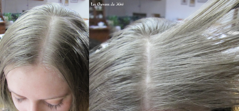 Comme je le redoutais, la deuxième semaine est plus difficile. Visuellement, il est évident que les cheveux sont gras ; mais étonnamment, ils sont plus gras aux mi-longueurs qu'en racine. Les racines sont au contraire plutôt légères, aujourd'hui les longueurs et les pointes sont plus imbibées.