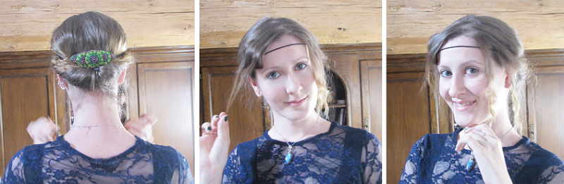 Une fois que tous vos cheveux sont rentrés dans la coiffure et enroulés sur eux-mêmes, placez le headband en mettant la décoration juste au dessus de votre chignon, et le fil sur le haut de votre front. Si besoin, vous pouvez sécuriser le tout avec des épingles neige ou des bobby pins.