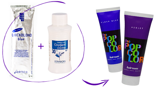Pour la décoloration, j'ai utilisé un oxydant à 30 volumes ainsi qu'une poudre décolorante bleue Quickblond blue de la marque Carin Haircosmetics. Pour la coloration j'ai utilisé une coloration semi-permanente (sans oxydation, comme un soin pigmentant) Pop color de Hairgum en teinte Flash Blue puis en Violet ce qui m'a donné ma teinte lilas actuelle. J'ai mélangé la poudre et l'oxydant à 1/3 poudre pour 2/3 d'oxydant.