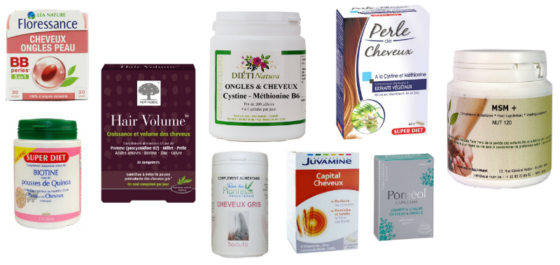 Sur le marché, on trouve des centaines de références en matière de compléments capillaires. Maxi-Hair, CystineB6, Kératine Forte, Hairfinity, Hair ceci, Cheveux cela. Certains sont même présentés avec des photos avant-après plutôt spectaculaires. Certains prétendent accélérer la pousse des cheveux, d'autres en stopper la chute, d'autres encore promettent un gain de volume ou de brillance... Ils fonctionnent en apportant certains nutriments supposément "bons pour les cheveux", la plupart du temps des protéines (acides aminés, cystine, etc) ou pire, certains contiennent de la kératine synthétique reconstituée (à savoir que la kératine... n'est pas assimilée par l'organisme).